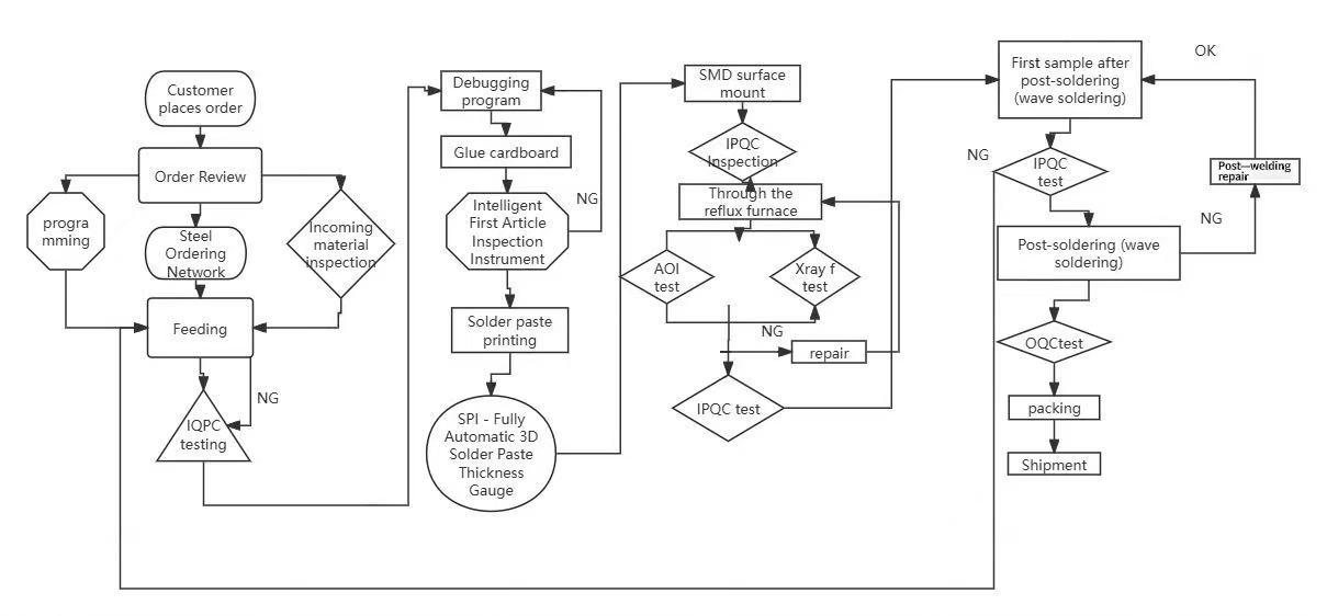 1.Glued cardboard: test the SMT placement position, reduce SMT trial production time and component waste, and ensure SMT quality. First article inspection: detect wrong materials, missing parts, polarity, direction, silk screen, etc.;