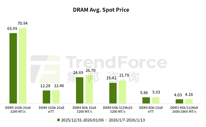 DRAM Spot MarketThanks to the strong growth in contract prices, spot prices have maintained a consecutive upward trend. In the meantime, suppliers and intermediaries holding inventory have shown a clear reluctance to sell, resulting in a rather tight overall trading volume. The price of mainstream DDR4 1Gx8 3200MT/s memory chips surged by 9.64% in the week from January 7 to January 13, climbing from US$25.407 on January 7 to US$27.857 on January 13.